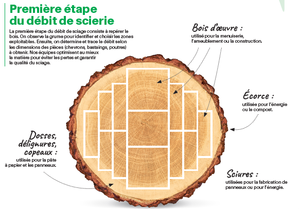 Le bois brut livré à la scierie à Anduze provient d'exploitations forestières gérées durablement. Elle comprend un parc à grumes dans lequel est stocké l'ensemble des bois bruts. Une grume est un tronc d'arbre non encore équarri ou plus communément encore couvert de son écorce. Une ligne de sciage permet aux équipes d'assurer la découpe de bois selon les demandes des clients. L'opérateur saisit dans sa machine l'épaisseur demandée pour la planche ou la forme finale de la poutre ronde ou carrée. Une fois découpés, les produits finis devant être livrés bruts sont triés et stockés. Pour le reste, un bac de traitement classe II jaune est prévu pour protéger le bois contre les insectes.